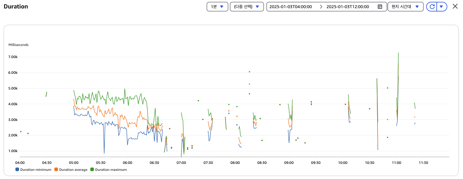 서버 비용 절약을 위해 파싱 작업 역시 Supabase API 서버에서 처리하였기 때문에, 평균 3초 정도의 긴 시간이 소모되었습니다. 또한 Supabase API 서버에 메일 파싱 요청을 전달하는 Lambda 함수도 메일 저장 여부 확인 후 종료되는 방식으로 구현되어 있어 함수의 Duration, Throttling 지표가 높게 측정되었습니다. 이로 인해 Lambda의 리소스를 사용하지 않음에도 실행시간이 길어 비용이 높게 측정되는 문제가 발생하였습니다.