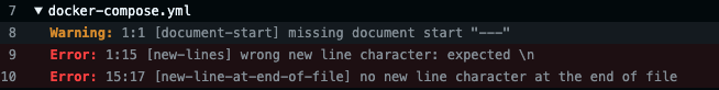 yamllint docker-compose.yml결과적으로 파일의 중간 개행문자가 \n 이 아니고, 마지막 개행문자가 없다는 로그를 확인할 수 있었습니다.