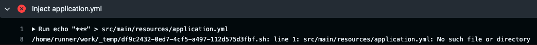 ls -R src/ 명령어를 활용해 파일 구조를 확인한 결과, src/main 내 resources 디렉터리가 존재하지 않는다는 것을 깨달았습니다. 로컬에 있는 yaml 파일들을 모두 gitignore 처리해주었고, 별도의 static 파일이 없었기 때문에 디렉터리가 존재하지 않아 디렉터리 생성 명령어를 추가하여 이를 해결하였습니다.