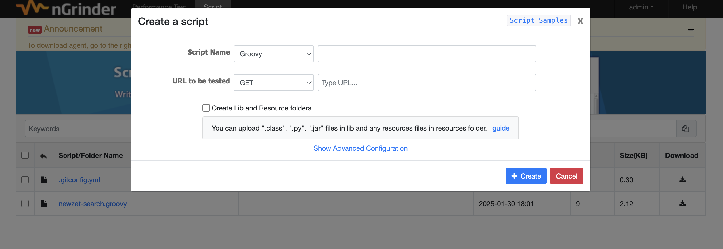 이를 위해 nGrinder는 controller에서 성능 측정을 위한 웹 인터페이스를 제공하여 개발자가 부하 script를 구성하고 모니터링 할 수 있게끔 도와준다. controller는 웹 인터페이스를 제공하기 때문에 기본적으로 8080 포트를 통해 접속할 수 있다.